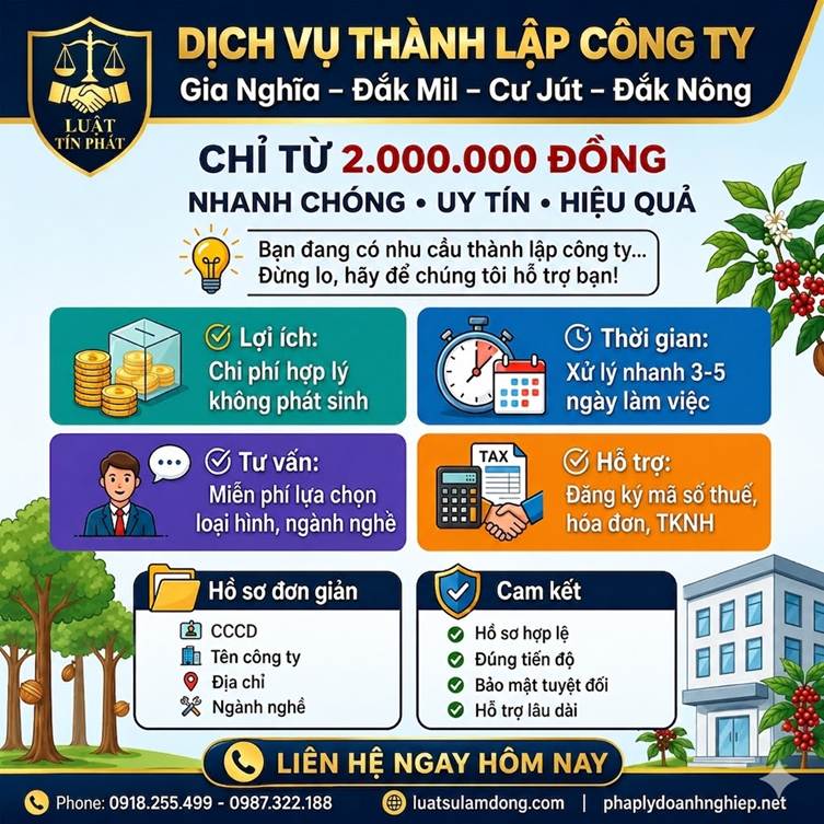 Bạn đang có nhu cầu thành lập công ty tại Gia Nghĩa, Đắk Mil, Cư Jút nhưng chưa rõ quy trình, thủ tục pháp lý? Hãy để chúng tôi hỗ trợ bạn với dịch vụ tiết kiệm