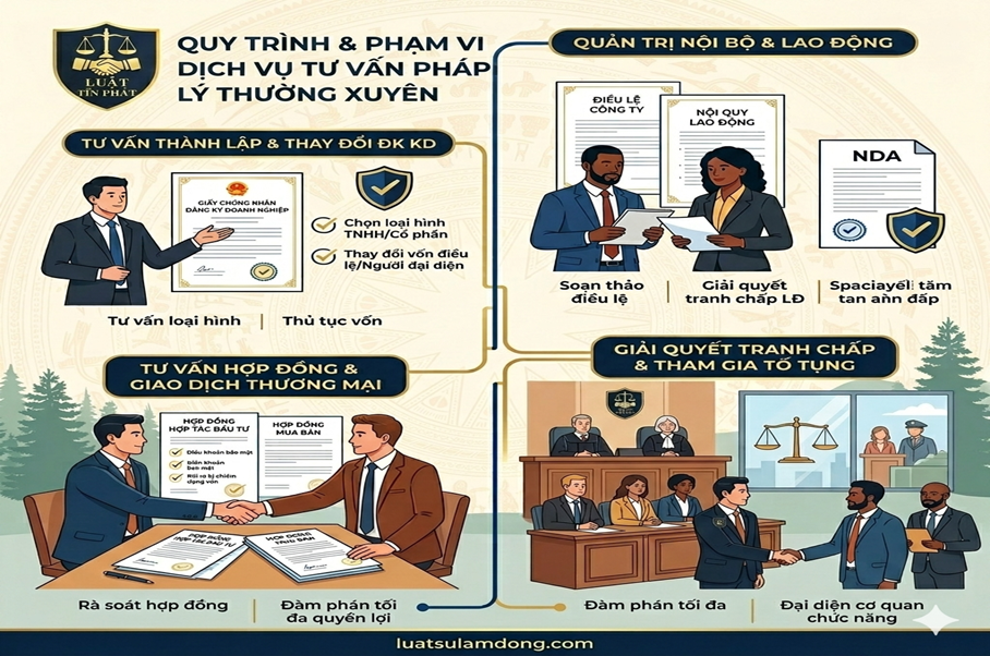 - Tư vấn thành lập và thay đổi đăng ký kinh doanh: Lựa chọn loại hình công ty phù hợp (TNHH, Cổ phần), thay đổi vốn điều lệ, người đại diện pháp luật.