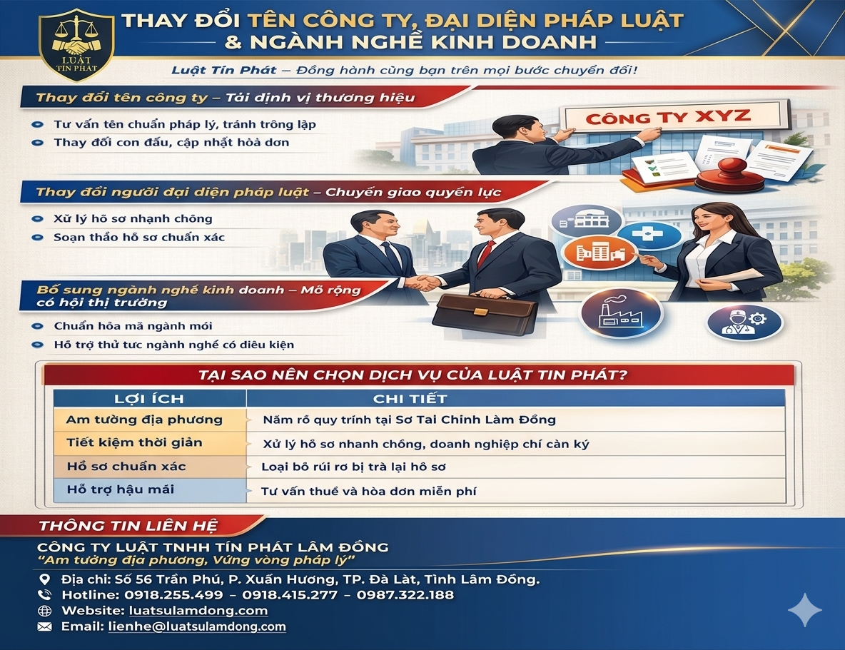 22/04/2026 7Trong lộ trình phát triển của mỗi doanh nghiệp, việc điều chỉnh thông tin đăng ký kinh doanh là bước chuyển mình cần thiết để thích nghi với chiến lược mới. Tuy nhiên, các thủ tục hành chính tại địa phương thường đòi hỏi sự chuẩn xác tuyệt đối về hồ sơ. Luật Tín Phát cung cấp giải pháp hỗ trợ trọn gói, giúp doanh nghiệp thực hiện mọi thay đổi một cách nhanh chóng, an toàn và chuyên nghiệp nhất.