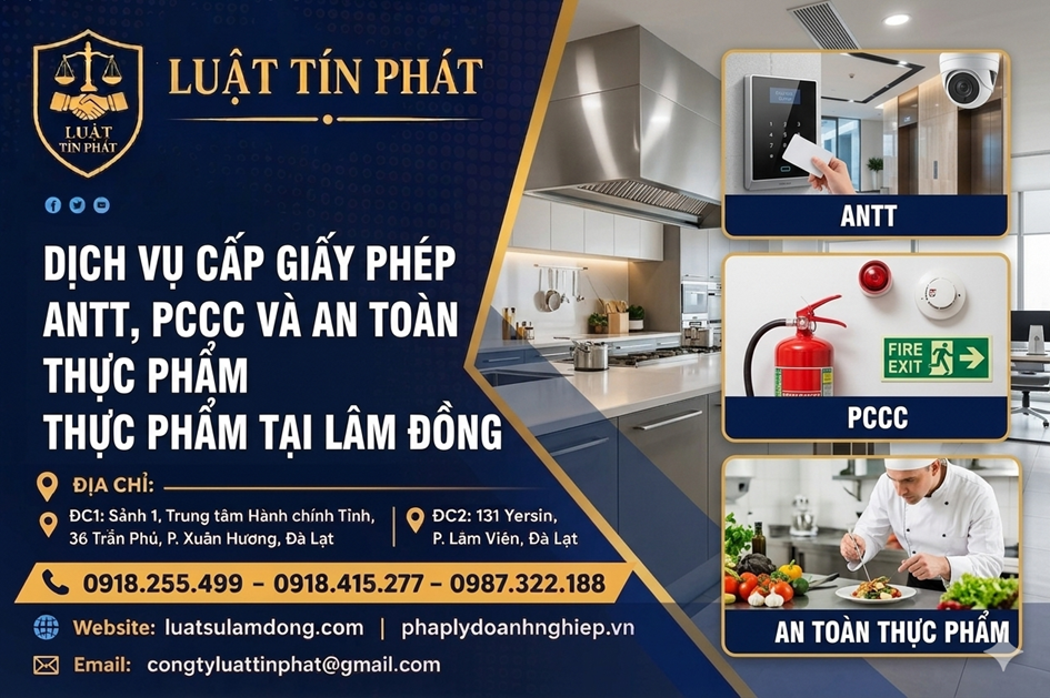Công ty Luật TNHH Tín Phát Lâm Đồng cung cấp dịch vụ tư vấn và thực hiện trọn gói các thủ tục về ANTT, PCCC và ATTP, giúp doanh nghiệp vận hành thông suốt và an tâm.