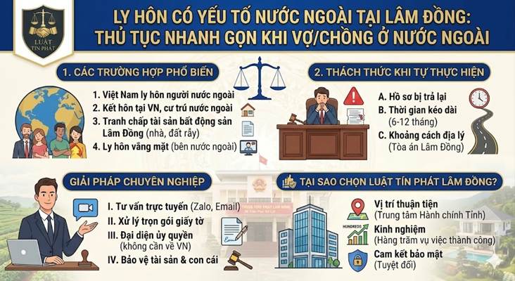 24/04/2026 3Ly hôn có yếu tố nước ngoài thường phức tạp hơn so với ly hôn thông thường do liên quan đến quốc tịch, nơi cư trú và thủ tục ủy thác tư pháp. Tuy nhiên, nếu nắm rõ quy định và chuẩn bị đúng hồ sơ, quá trình này vẫn có thể được giải quyết nhanh chóng tại Lâm Đồng.