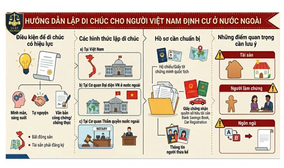 Người Việt Nam định cư ở nước ngoài khi lập di chúc đối với tài sản tại Việt Nam cần tuân thủ các điều kiện cốt lõi: phải lập thành văn bản trong trạng thái minh mẫn, sáng suốt, hoàn toàn tự nguyện và không bị ép buộc. Đặc biệt đối với các tài sản là bất động sản hoặc tài sản phải đăng ký quyền sở hữu, văn bản này cần được công chứng hoặc chứng thực theo đúng quy định.