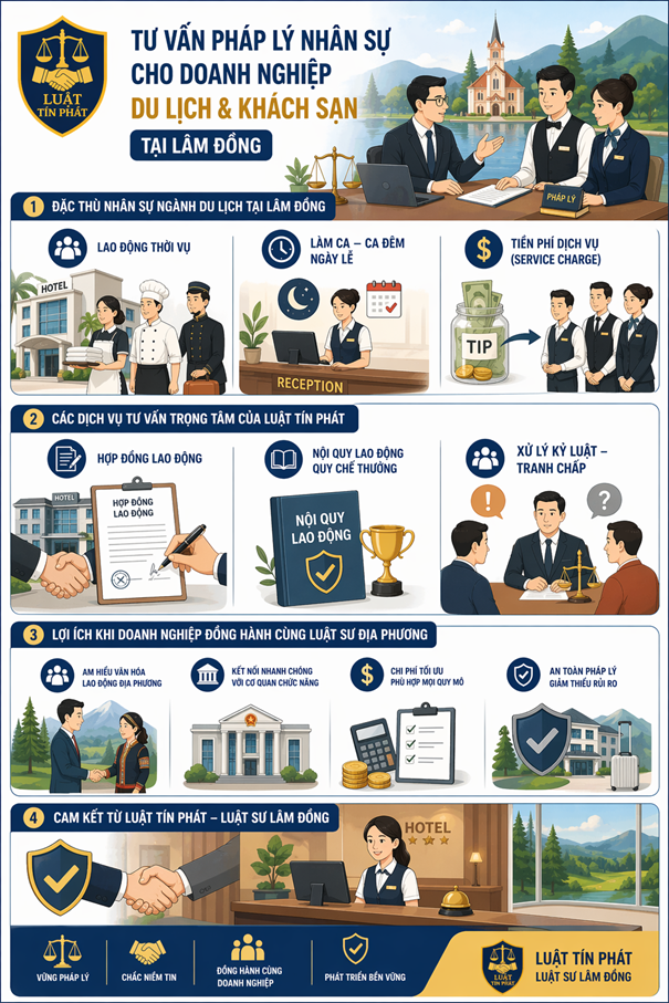 Luật Tín Phát cung cấp các giải pháp pháp lý tối ưu giúp các khách sạn, resort và công ty lữ hành tại Lâm Đồng vận hành bộ máy nhân sự an toàn và bền vững.